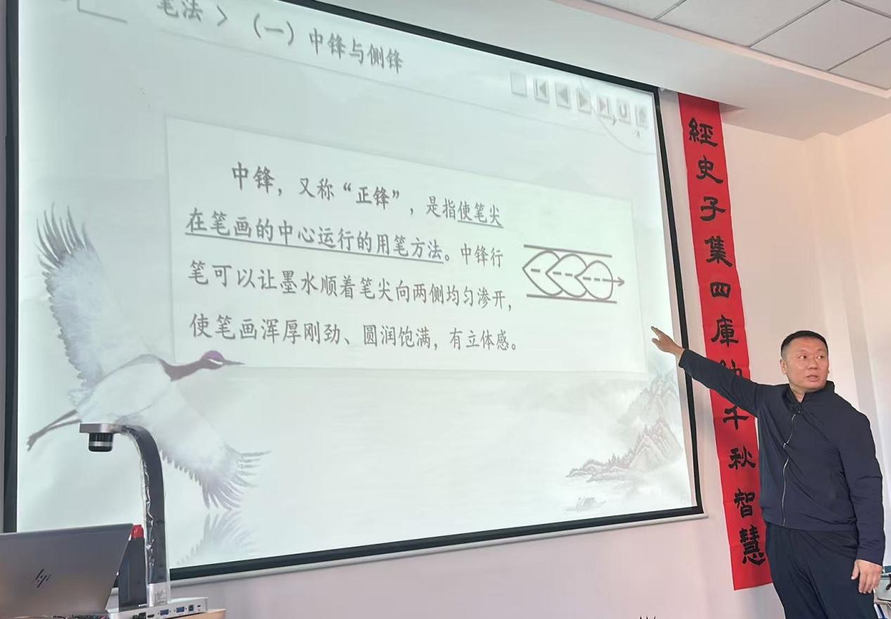 课堂伊始,马老师先通过用笔动作拆解与连贯书写演示,回顾了点、横、竖、撇、捺等基本笔画的书写要领,从起笔的藏露、行笔的力度到收笔的顿挫,逐一纠正学生的书写姿势与运笔技巧。