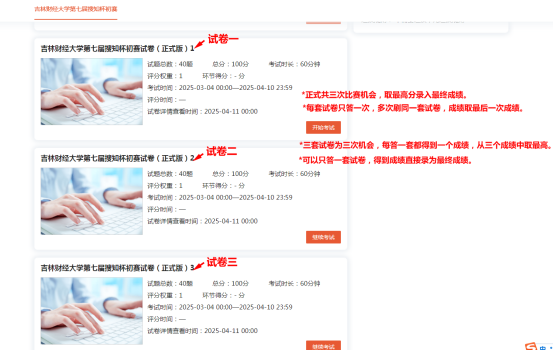 正式试卷为三套,每套试卷只能得到一次成绩,成绩为最后一次提交后成绩。每做一套试卷将得到一次成绩,我们将取其中最高分,录入排名。不要求每套试卷都完成。只要完成一套即可有成绩。完成答题后,一定要提交。